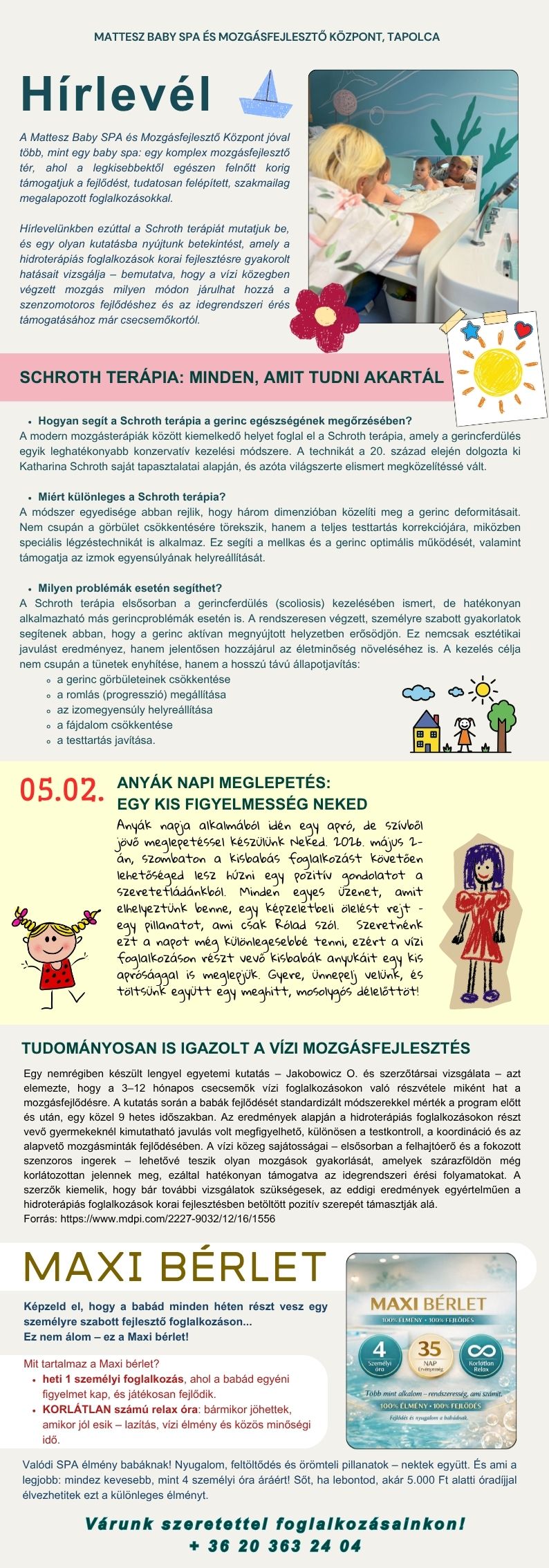 Hírlevelünkben ezúttal a Schroth terápiát mutatjuk be, és egy olyan kutatásba nyújtunk betekintést, amely a hidroterápiás foglalkozások korai fejlesztésre gyakorolt hatásait vizsgálja – bemutatva, hogy a vízi közegben végzett mozgás milyen módon járulhat hozzá a szenzomotoros fejlődéshez és az idegrendszeri érés támogatásához már csecsemőkortól.
